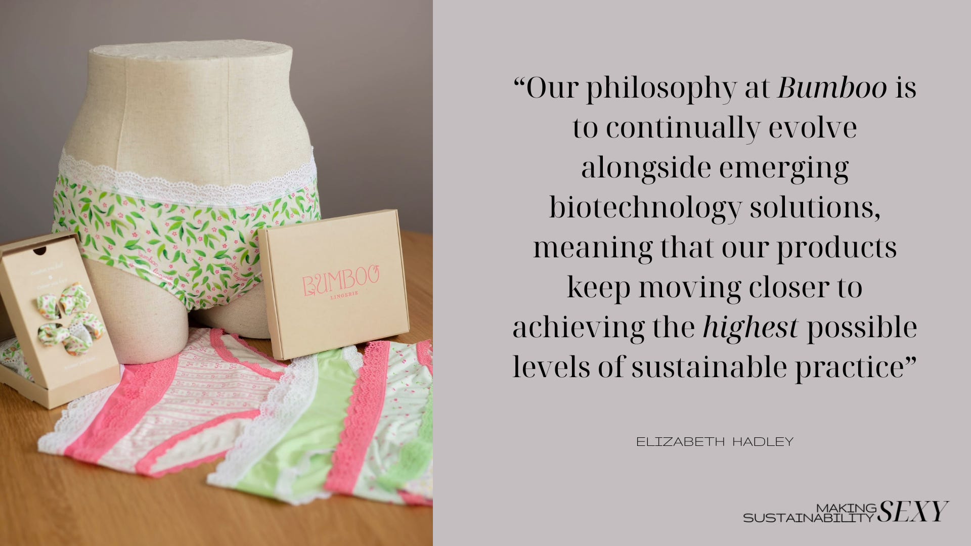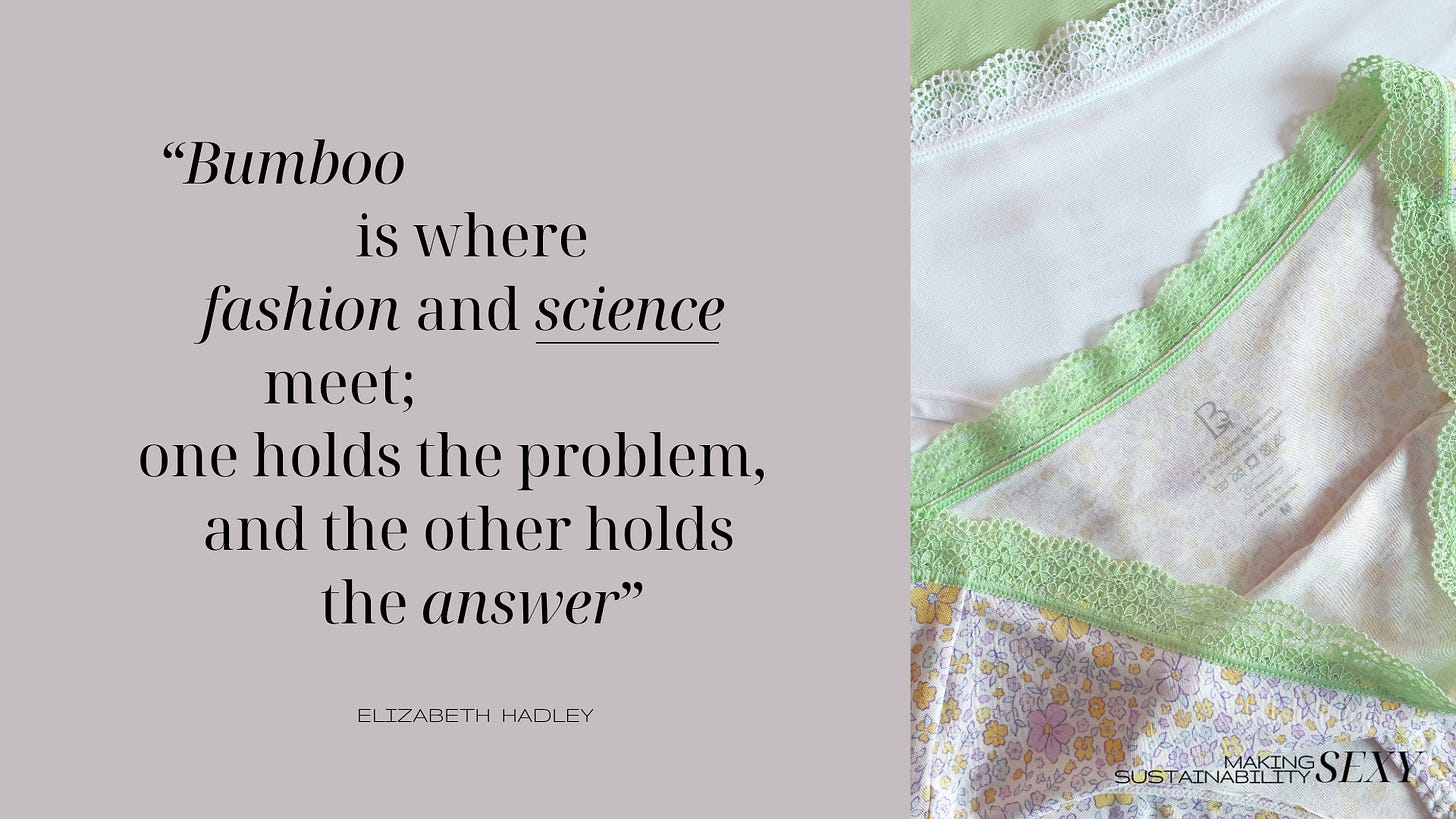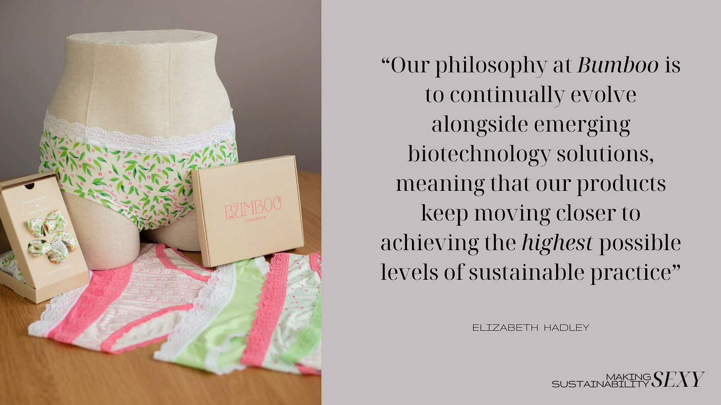 On our call Elizabeth stated that for too long the industry has been “designing for the consumer’s eyes, instead of their values or health”; but now Bumboo exists to put an end to that approach to production. Blending the bio-chemistry behind bio-materials, and with a great love for empowering everyone wearing Bumboo’s silky soft underwear, Elizabeth is redefining the intimates industry - one pair of knickers at a time.